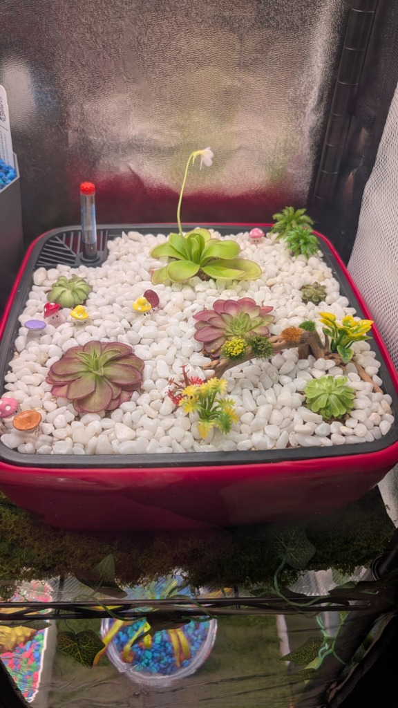 Feeding: Feed bugs, dried bloodworms, fish food, or diluted foliar fertilizer such as Maxsea every 2-3 weeks