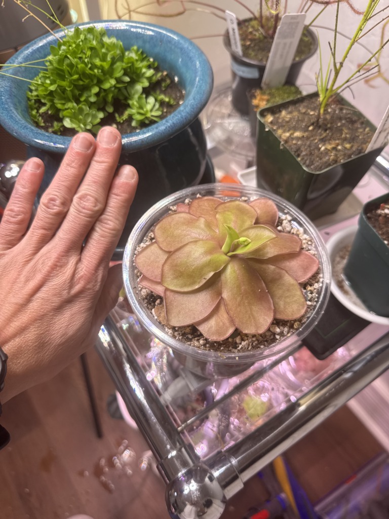 Water: While in its carnivorous phase, provide enough distilled water for the media to remain damp. Reduce watering and allow the media to dry out regularly once the succulent rosette begins to form.
