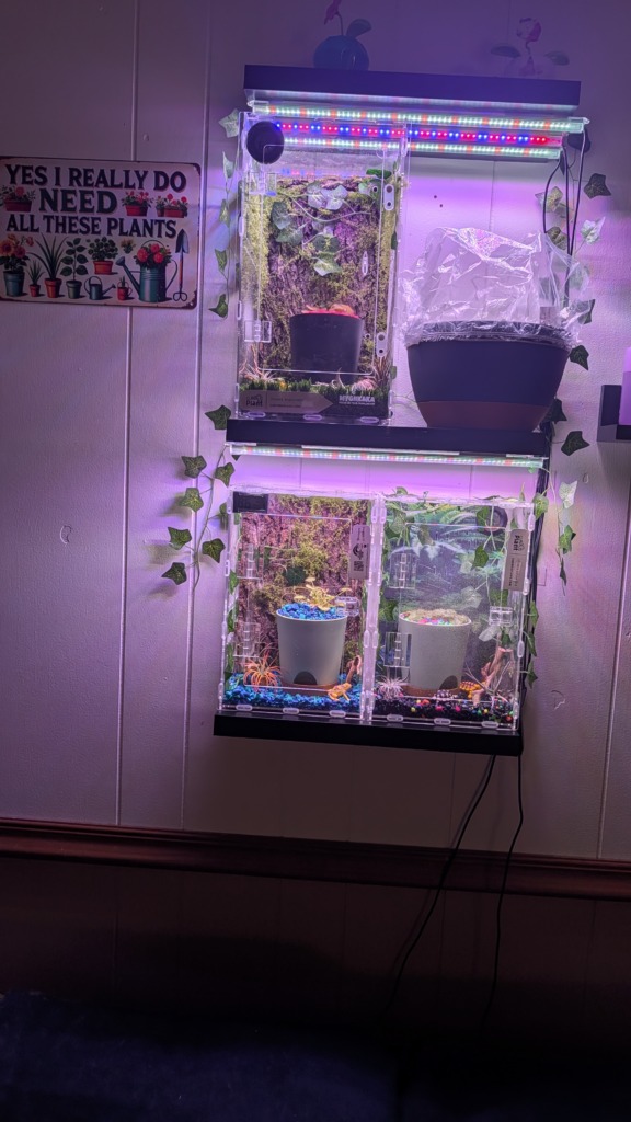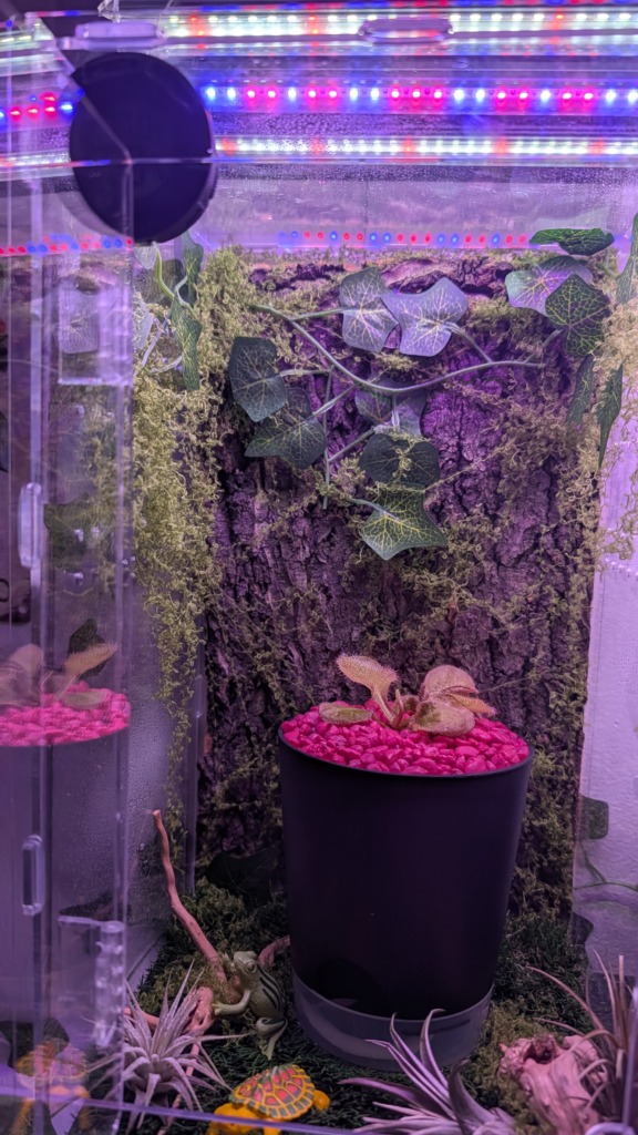 Feeding: Feed bugs, dried bloodworms, fish food, or diluted foliar fertilizer such as Maxsea every 2-3 weeks